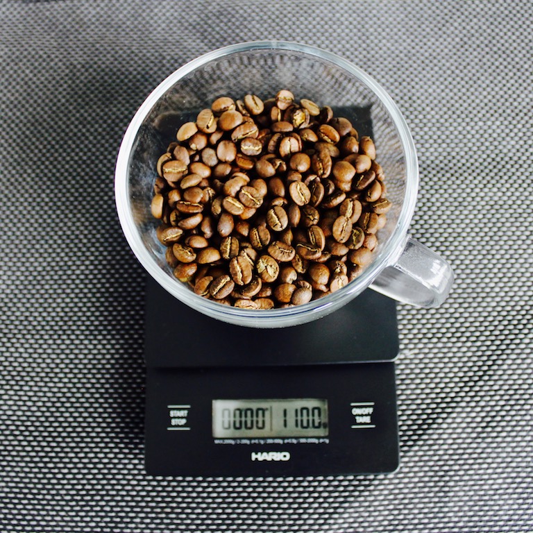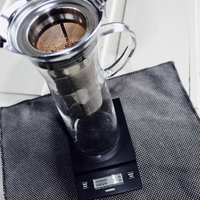 Kaffee abwiegen, je nach größe des Behälters in dem Ihr den Cold Brew ansetzt. Wir haben zur Orientierung auf 1,1 Liter Wasser, genau 110 Gramm Kaffee gegeben.