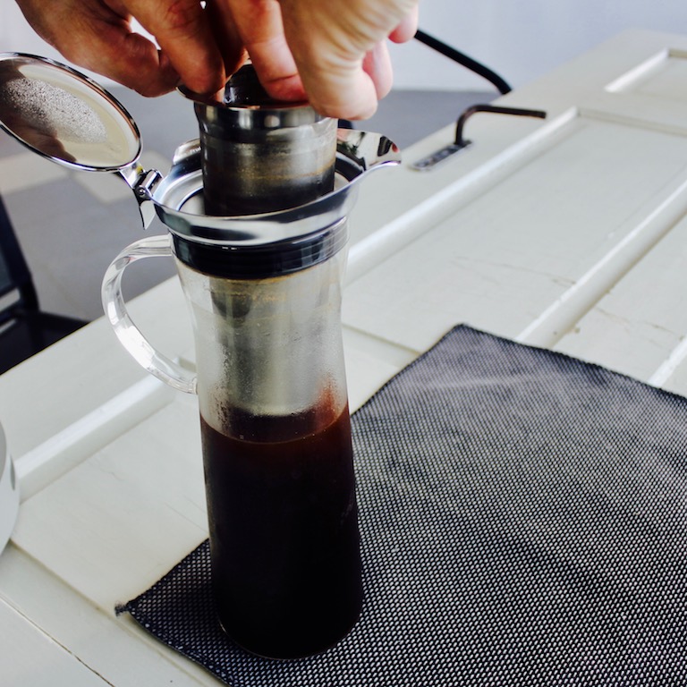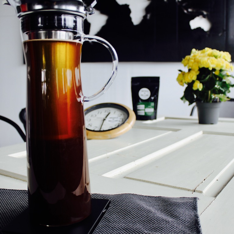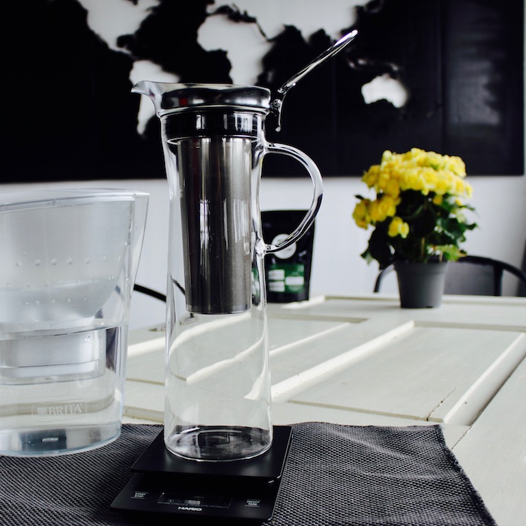 10-14 Stunden Ziehzeit. Das braucht der Kaffee. Bei der Kaltextraktion geht es etwas gemächlicher zu. Im Gegensatz zu heißem Wasser braucht das Kalte viel mehr Zeit um die gewollten Aromen und Co. aus der Bohne herauszulösen. Ihr könnt die Kanne auf der Theke stehen lassen. Wir bevorzugen aber den Kühlschrank. Achtung – versucht ein Timing für die Ziehzeit zu entwickeln. Ideal finden wir 12-16 Stunden. Länger = intensiver, aber nicht unbedingt besser!