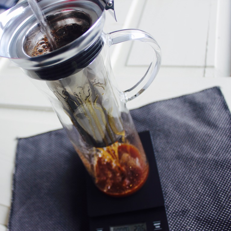 Beim eingießen des Wassers achtet darauf, dass Ihr euer Cold Brew Gadget soweit voll macht, dass auch nachdem das Kaffeemehl etwas Wasser aufgesaugt hat, das Wasser noch das ganze Kaffeemehl bedeckt. (Nicht nötig bei der French Press variante).